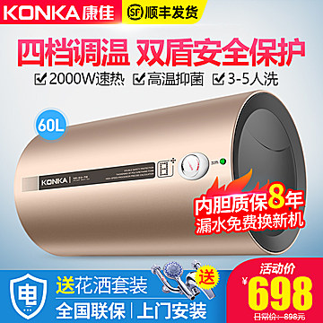 【康佳品牌】19年新款热水器,60L可供全家使用,金色外壳,四档调温,2000W双管速热,热水不久等!双盾+6重安全防护,美国搪瓷内胆保用8年,2级能效节能省电!送货入户,预约安装。【送花洒套装】
