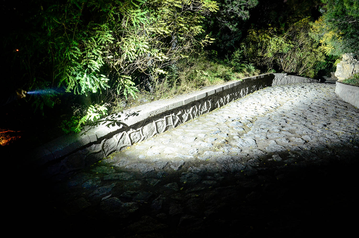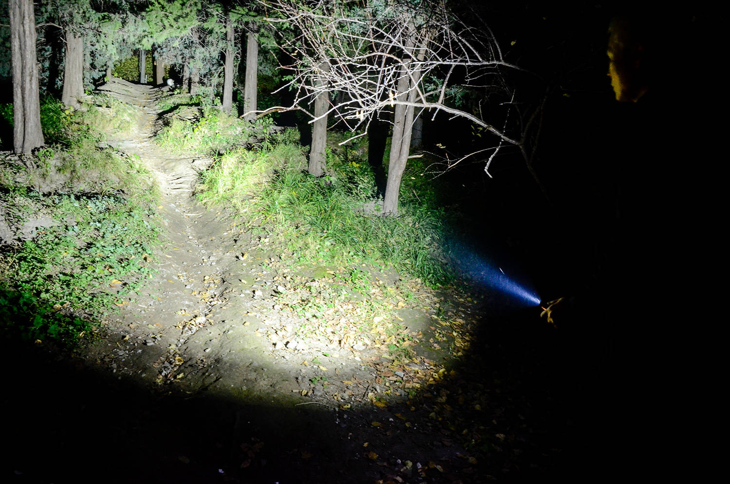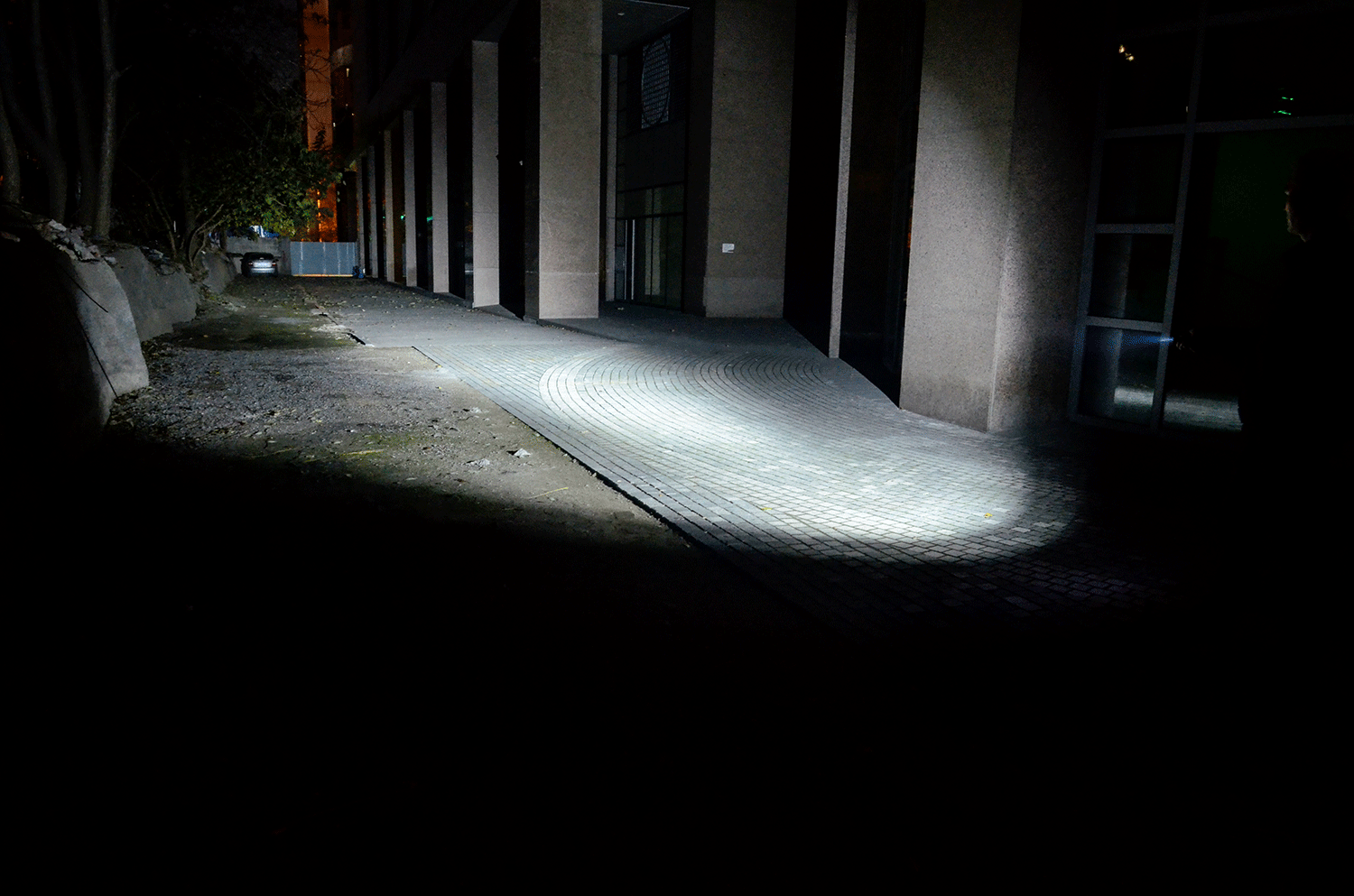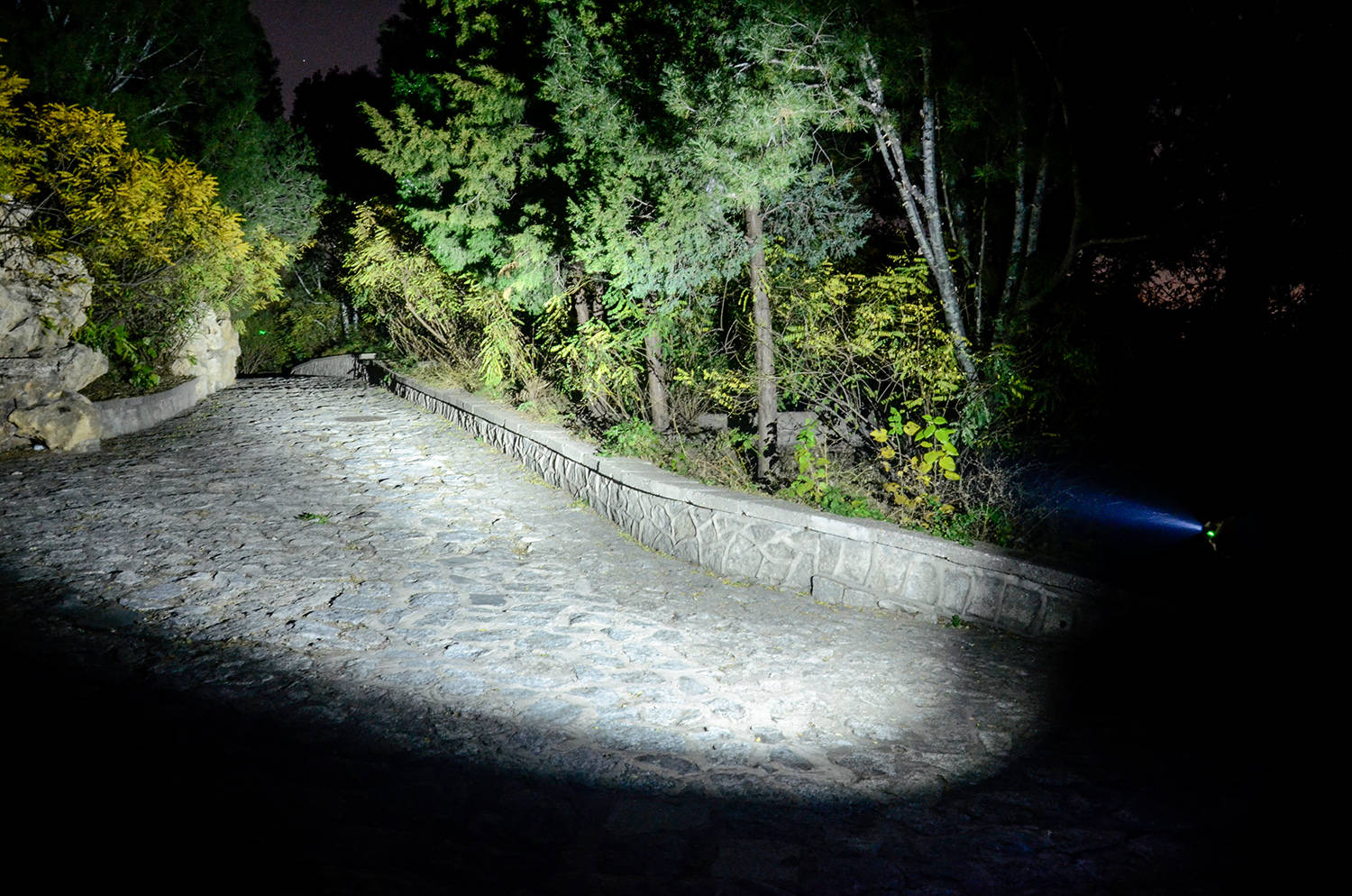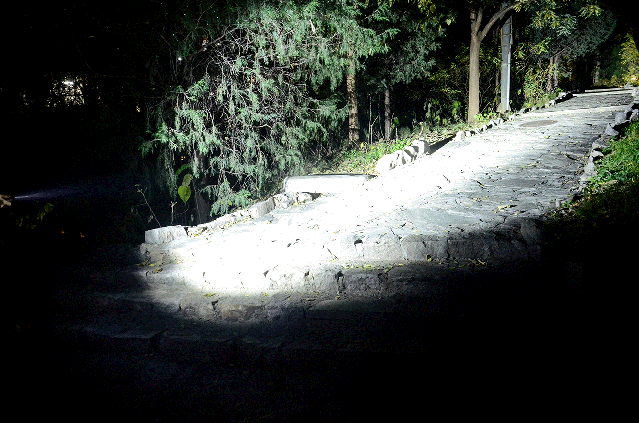 中心最大光强12400坎德拉,有效照明距离230米,作为EDC手电来讲,效果非常好,而且还能同时开启正中的绿色激光定点准星(下图中沿着光柱最前方路的尽头是绿色激光单),看得清、定位准。