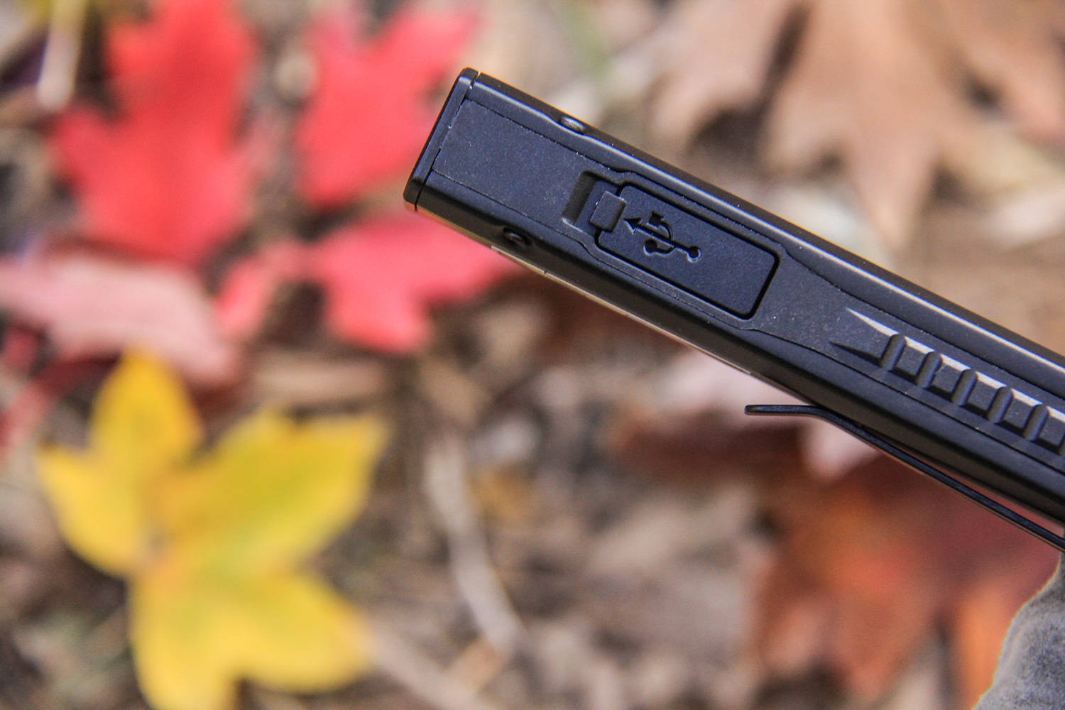 EDC17的另一条侧楞上靠近灯头的位置,是TYPE-C充电接口,平时通过橡胶塞封堵,具有较好的防尘防水防杂物效果。