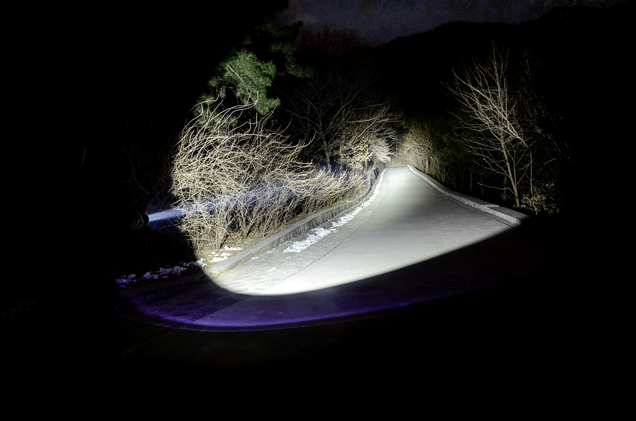 PK90中心亮度高,正白光色温,没有偏色的情况,照明效果主次分明,聚光效果好+一定的泛光区域,便于户外搜索、定点探照、远距离照亮,当然了明亮清晰的光柱也能作为光信号源,既能精准定位远处目标,又能兼顾周围环境照明,不管是夜爬探路还是野外搜寻都游刃有余。