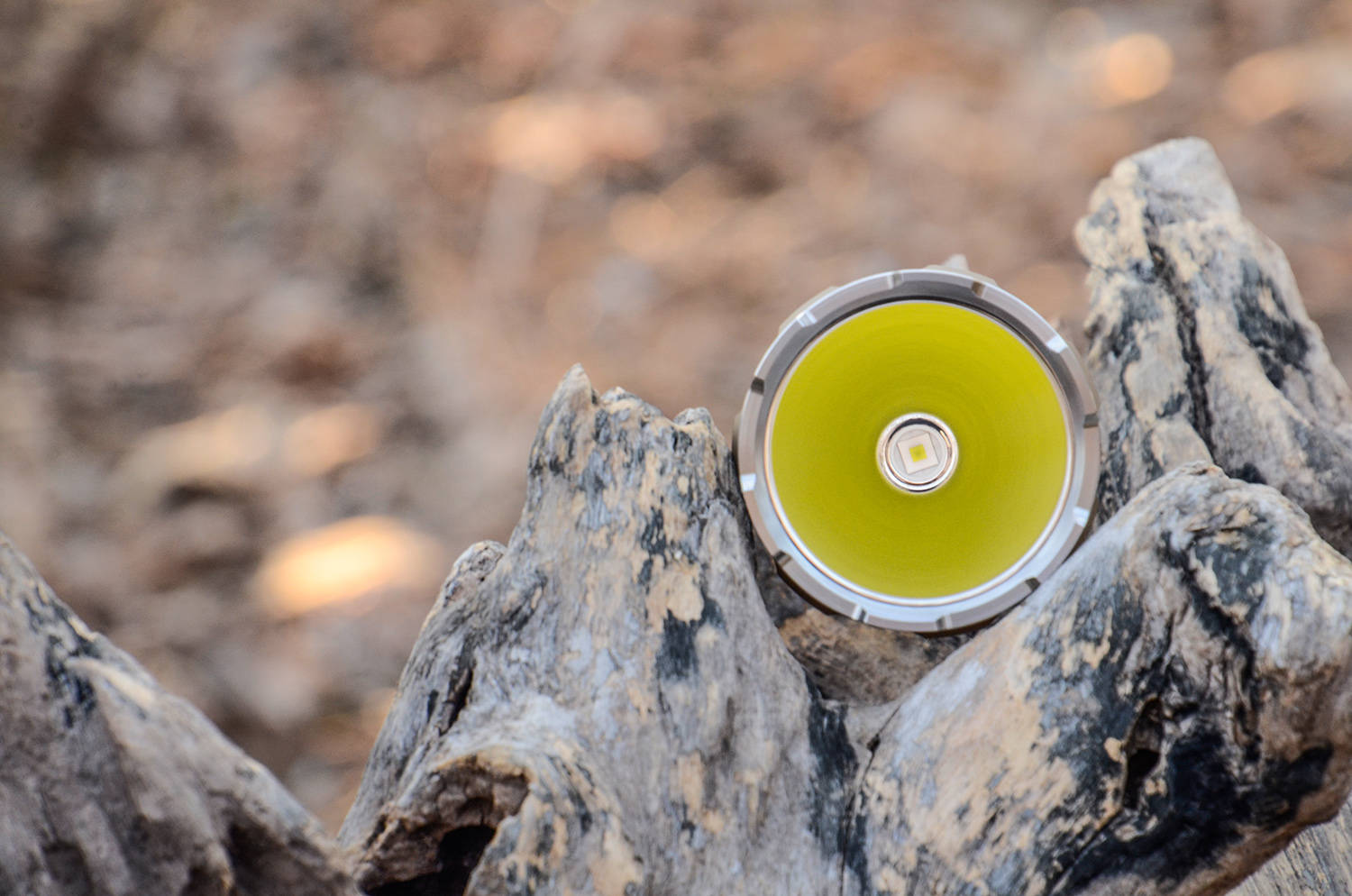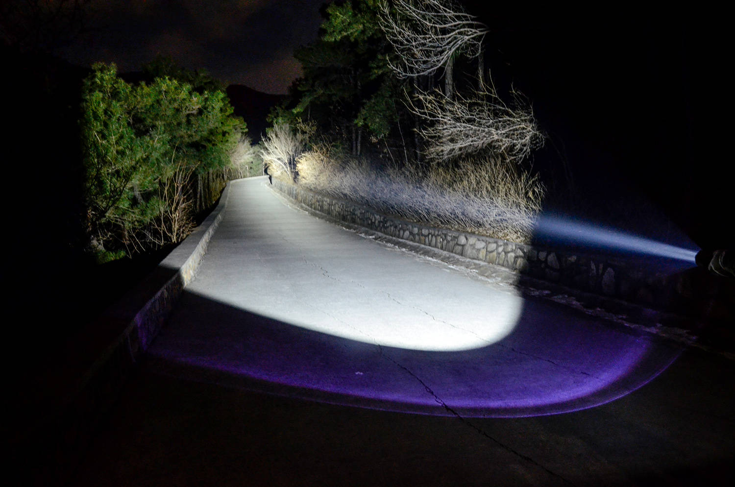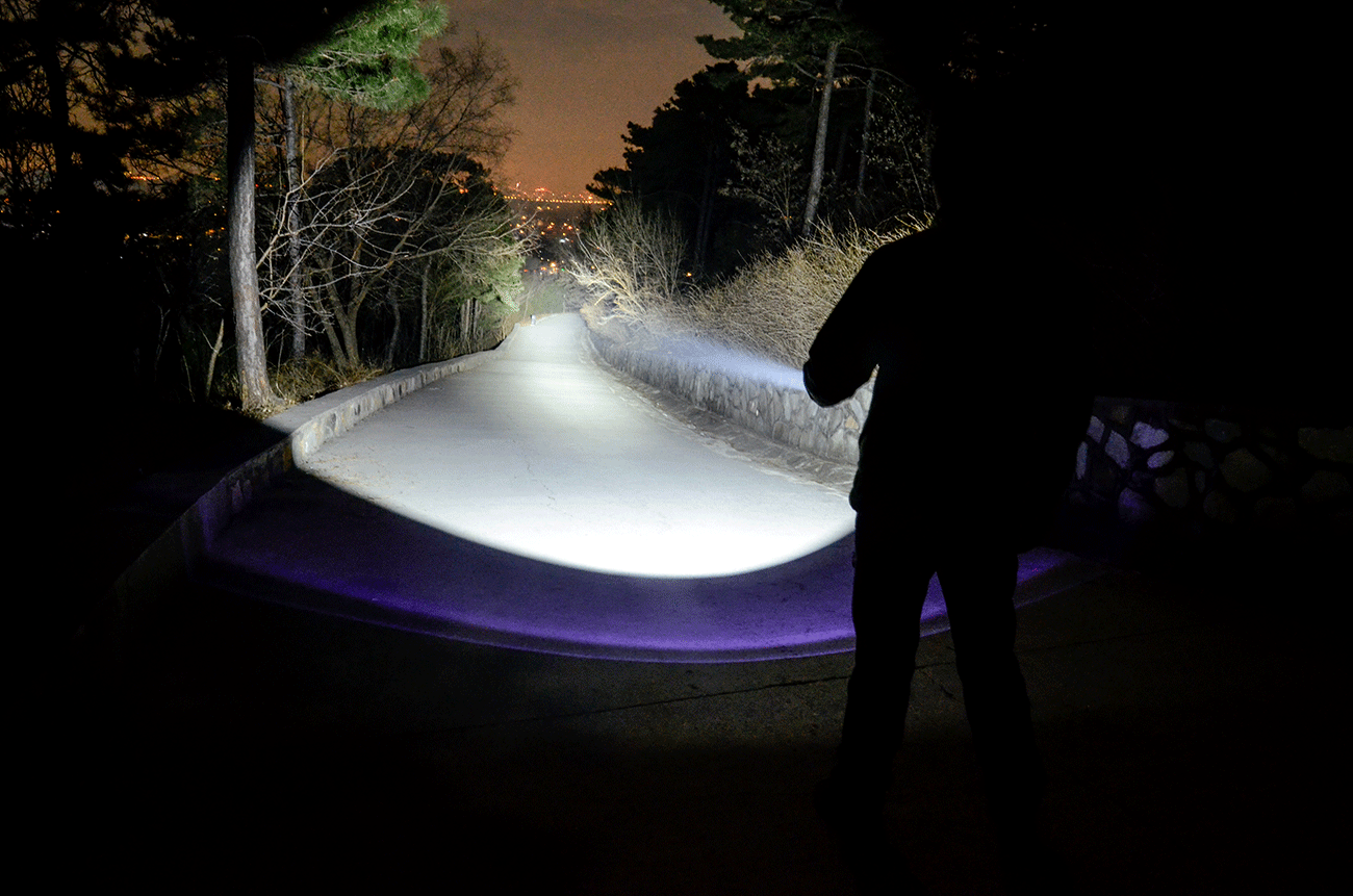 实际的光线汇聚起来,就形成小而圆且亮的主光斑,距离百米开外也就是一棵树的大小,正圆形主光斑的中心亮度高,光斑内的亮度均匀,与泛光有明显的分界线,泛光区同样与环境界线分明,这都是聚光手电的特点。