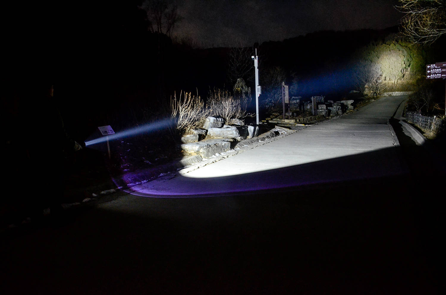 泛光的亮度比较适中,亮度均匀,与环境之间可以看到清晰地界线,即便灯头稍上抬,仍然能够把面前的路面铺满、照亮,在集中注意力于正前方的同同时,提亮环境,避免明暗差距太大而觉得不适。