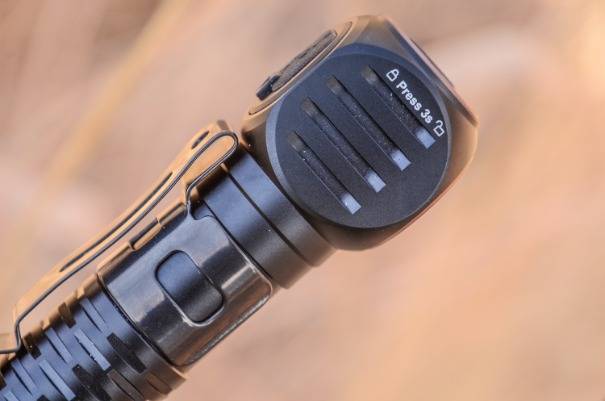 锁机功能,彻底解决了携带时的误触问题,根据主开关侧面的提示,在关机状态长按主开关3秒,泛光灯闪烁3次,进入锁机模式,避免因物品挤压导致头灯意外开机,再次长按两个主开关3秒,指示灯闪烁后即可恢复正常操作。