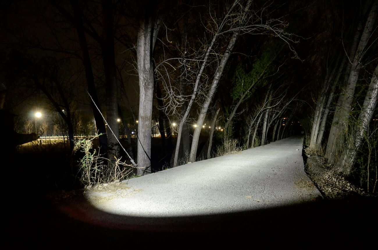 聚光最高亮度约为1000lm,中心光强5866坎德拉,有效照明距离153米;泛光的亮度约为750lm,中心光强914坎德拉,照明可以覆盖60米左右。
